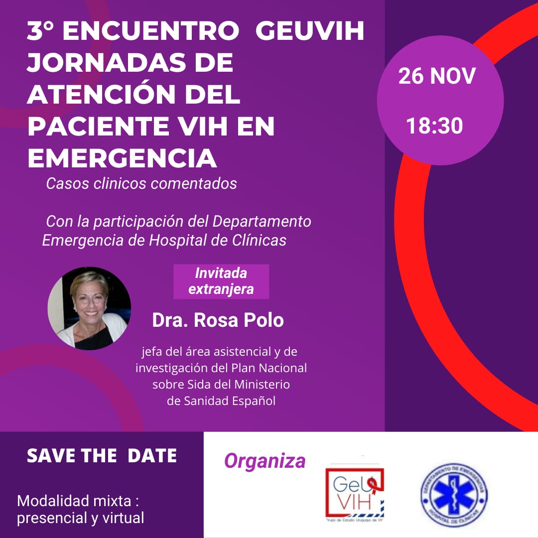 El próximo 26 e noviembre a las 18.30hs se desarrollará en modalidad mixta: presencial y virtual, el tercer encuentro GeUVIH, Jornadas de Atención del Paciente VIH en Emergencia.